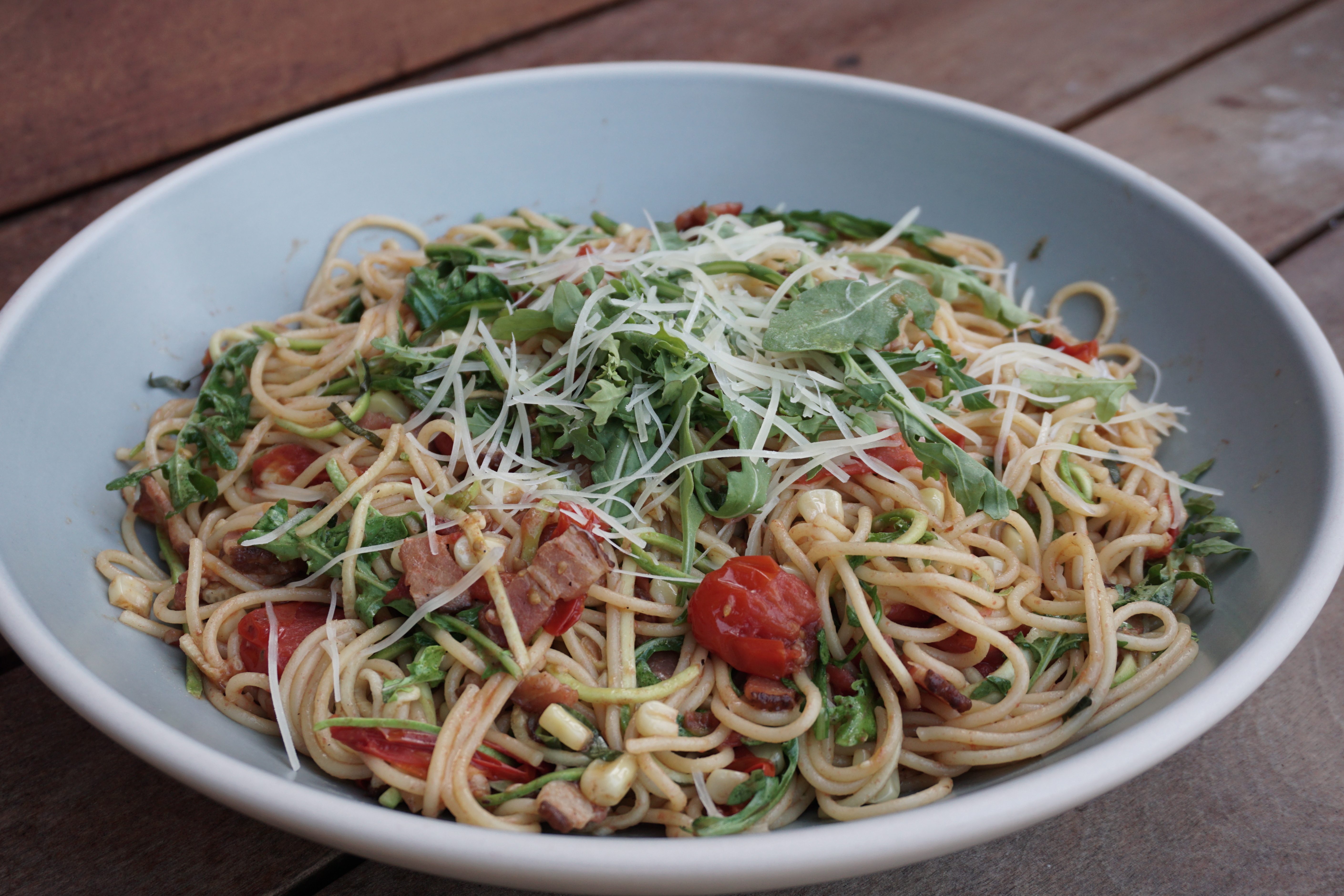 Pasta with Bacon, Cherry Tomatoes, Corn, Arugula and Zucchini