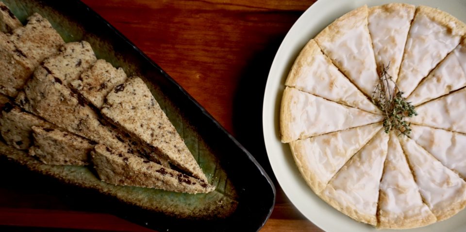 I changed the baking method for the Grapefruit Thyme Shortbread, my non-vegan option.  Wanting a more traditional shortbread and keeping with my wedge theme, I baked it in a round pan and cut it into wedges right out of the oven.  Unlike the first time I made them, this version had a casual, rustic appeal.  While the cutout version had a fine crumb and crisp edges. These are a bit softer, almost cake-like, without the crisp edges. Still delightful, just different.  Putting on my ATK hat, made sense due to the differences in baking methods. I consider this a bonus, 2 cookies for the “dough” of one.