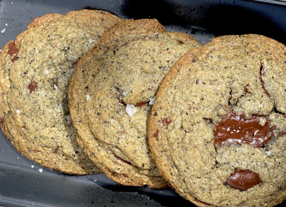 The flavor of the day is toasted black sesame seeds. They’re delicious-earthy, nutty, and bolder than white sesame seeds. They add texture, color, and zing to cookies, cakes, and just about anything. During the holidays, I made black sesame shortbread, a tasty riff on shortbread. So, when Black Sesame Chocolate Chip Cookies from Cooking Therapy skittered across my feed, “so making these” was imprinted on my brain.