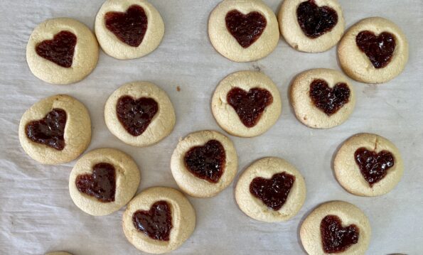 Just in time for Valentine’s Day…2024! Thumbprint cookies with a heart-shaped center. Do I hear a collective “Awwwww, how cute”? Yes! I came across these…