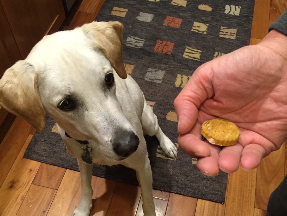 Sammy, being part lab gobbles up almost everything we give him, these were no exception! We baked them for 30 minutes for a nice crunchy biscuit. Baking them less would yield a soft chewy biscuit that lasts approximately 3-5 days. The drier version will last a bit longer.