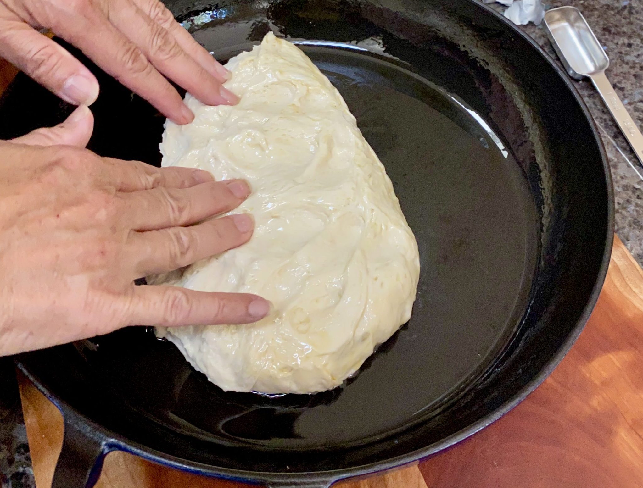 So a day later, take the dough out of the fridge and  smoosh it into a cast-iron skillet, I used my Staub pan or a 9-inch cake pan would work too.  But, keep in mind a heavy bottom skillet, especially cast-iron, enhances the crispiness.