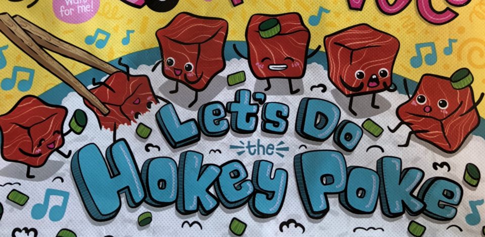 I picked up the cutest recyclable grocery bags at the checkout counter.  Each bag is decorated with cartoon drawings of rice balls, sushi and local island foods plus I got 5% off on my purchase for buying the bags.  How cool is that?   I also picked up island cookies, crunchy shortbread-like cookies with macadamia nuts…I’m a sucker for shortbread. Poke, SPAM, cookies, and recyclable bags, I head out a happy camper.