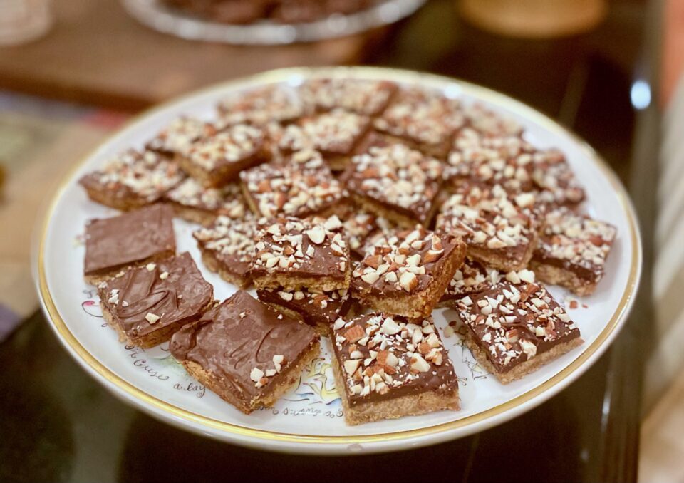 I found it! Buried in my recipe binder, a treasured recipe from my friend Joy’s mom. My favorite holiday cookie, Mrs. S’s Toffee Squares. As soon as we received her plate of Christmas Cookies I laid claim to those Toffee Squares, and truth be told, her Crescents, Pecan Tartlets, and Spritz Cookies… lol.