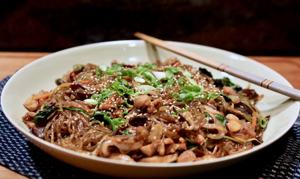 The beauty of this dish is its flexibility. Serve Japchae as a simple side dish, banchan, or as a main dish made with protein and vegetables. Vary the kinds of vegetables and protein, but always include shiitake mushrooms, yellow or red onions, and secret sauce (ok, not really a secret just the Korean quadfecta of soy, garlic, sugar, and sesame).
