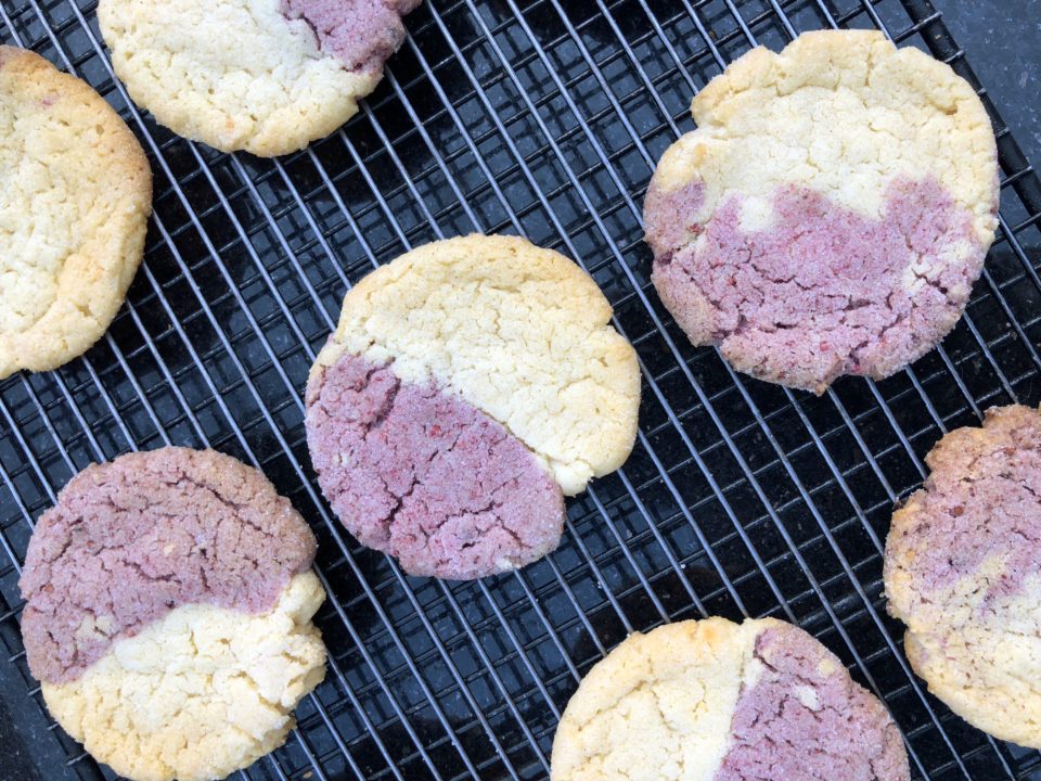 Use good quality white chocolate.  Jamie used white chocolate chips that in hindsight may have caused the dough to be a bit dry and a little difficult to work with.  I had inadvertently picked up dried raspberries instead of strawberries which worked out great. The raspberry’s purple tinge and tartness worked well in the cookie’s taste and color.  Both freeze-dried berries are available at Whole Foods and Trader Joe’s.