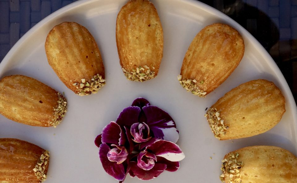 • Add pistachios. Roll the end of each madeleine in the crushed pistachios, letting them adhere to the honey glaze.