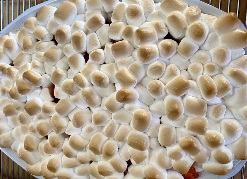 Every Thanksgiving I look forward to my cousin Gary’s Sweet Potatoes. As sure as there will be a turkey on the table, his sweet potatoes will also be there. Drenched in butter and brown sugar and covered in a blanket of toasty mini-marshmallows, it is the veggie-carb highlight for me. As I make my way around the table, I’ll squish everything else to one side of my plate to make room for those bedazzled yams. I’ll angle the spoon just so as to get “more than my share” of warm, gooey, toasty marshmallows. I’ll go back for seconds and then pack a little box (ok, not so little) to take home.