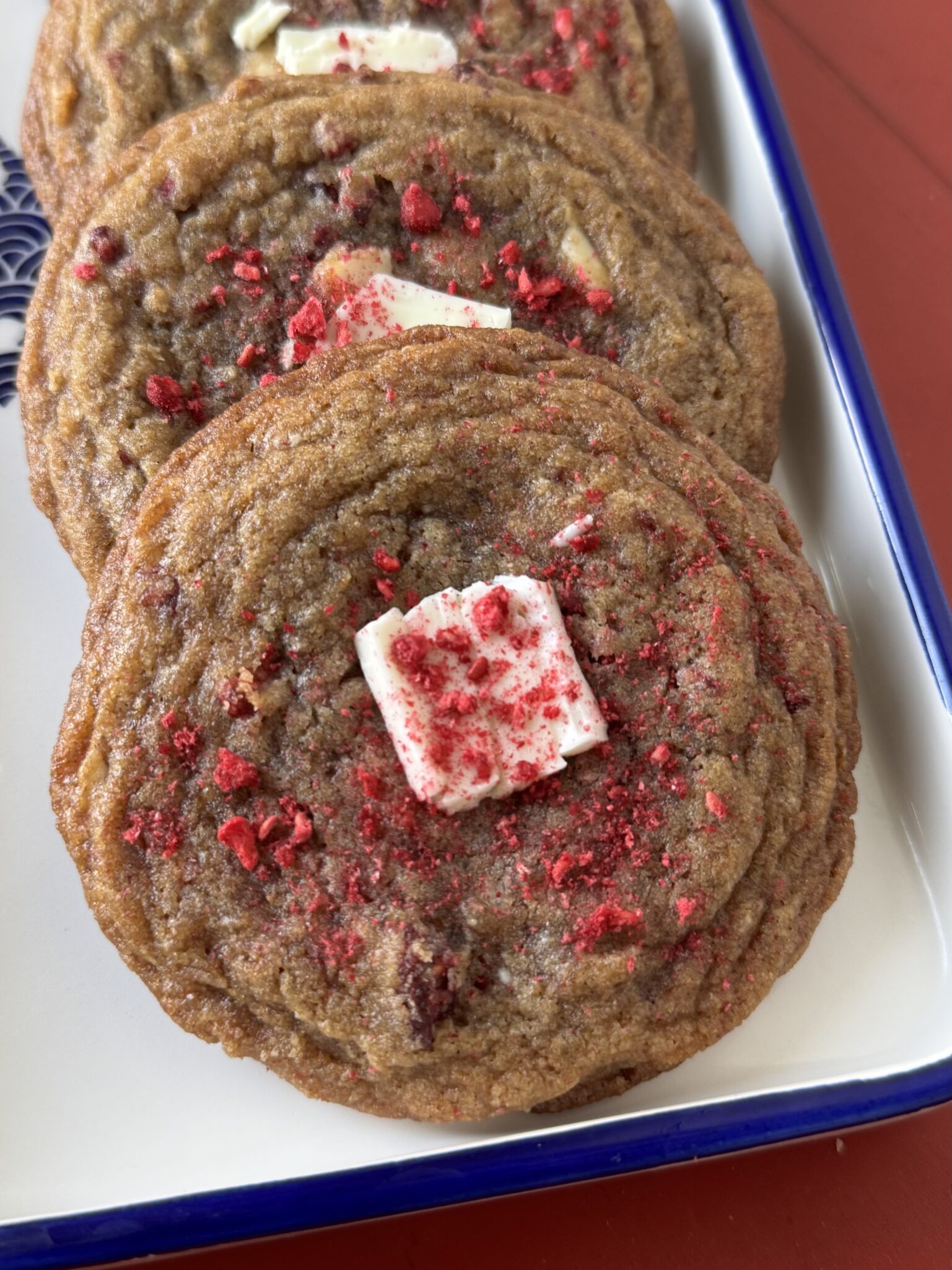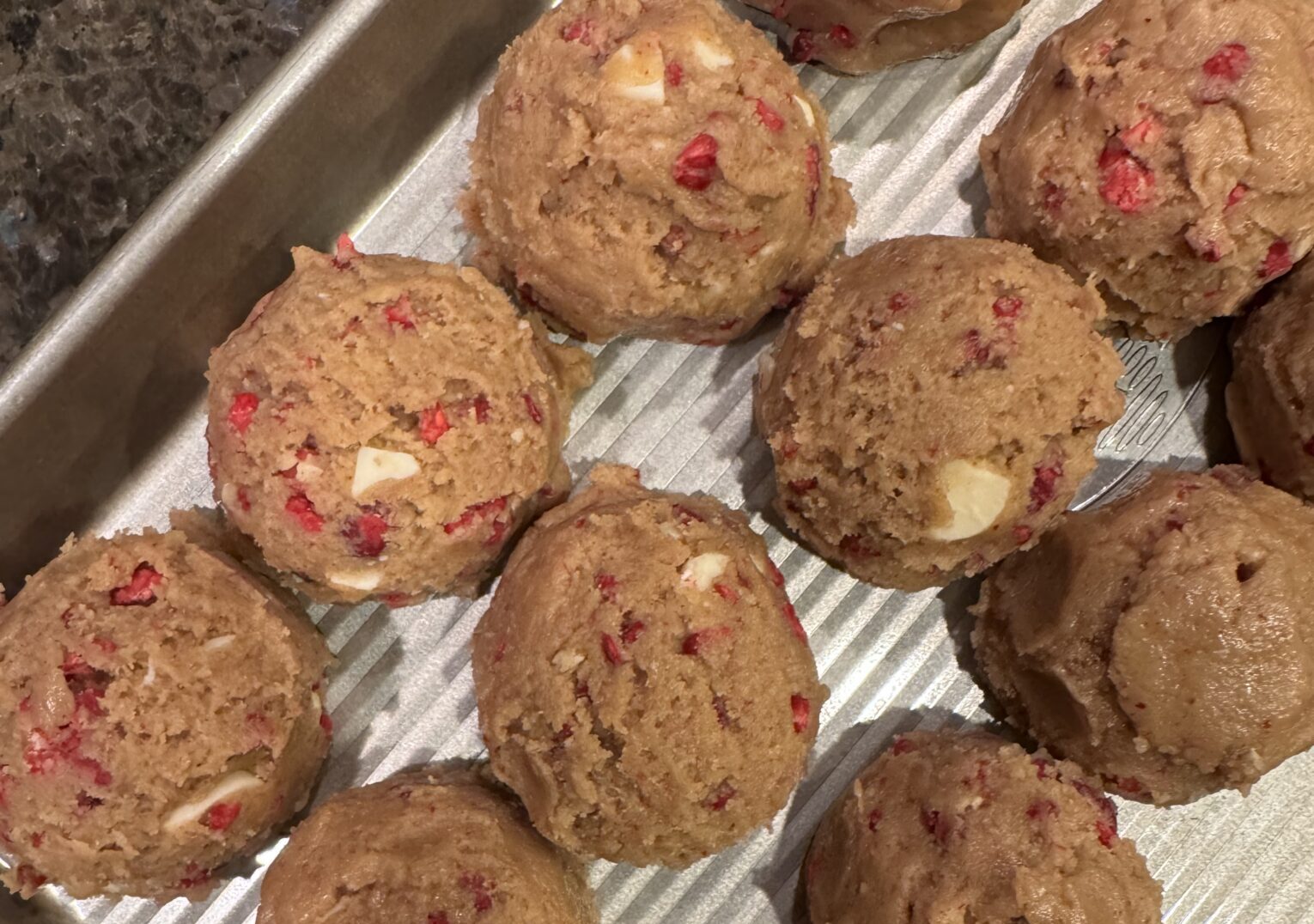 Raspberry: The recipe calls for freeze-dried raspberries. Freeze-dried fruits are AMAZING. Available for a variety of fruits, they provide flavor and color. Trader Joe’s carries quite a few, and more importantly, I’ve seen raspberry back on the shelves lately. I’ve often substituted strawberry for raspberry. Ultimately, the play between the sweetness of white chocolate and the tartness of the raspberry sets this cookie apart.